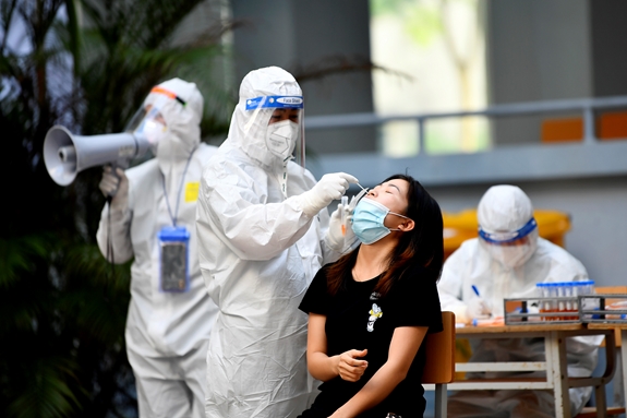 | Nhân viên y tế lấy mẫu xét nghiệm SARS-CoV-2 cho người đang trong khu cách ly trường Đại học Nông-Lâm Bắc Giang (huyện Việt Yên, tỉnh Bắc Giang). Ảnh: TUẤN HUY. |