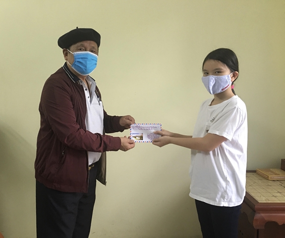 Bác Phạm Văn Lê, Tổ trưởng Tổ dân phố số 1 nhận tiền ủng hộ từ cháu Phạm Khánh Linh. |