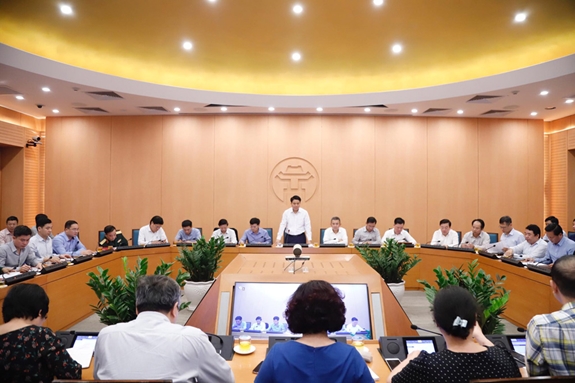 Quang cảnh cuộc họp Ban Chỉ đạo công tác phòng, chống dịch Covid-19 thành phố Hà Nội chiều 9-3. |