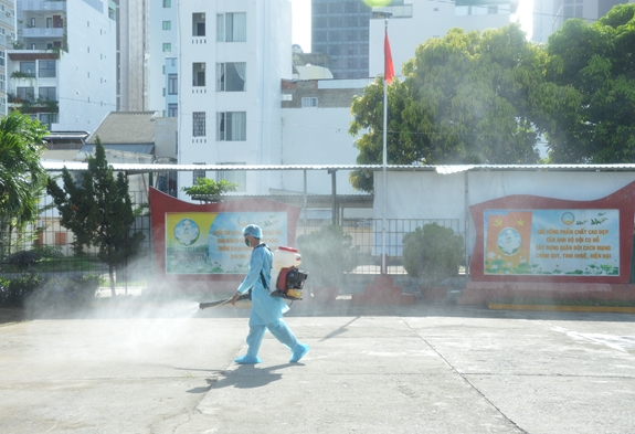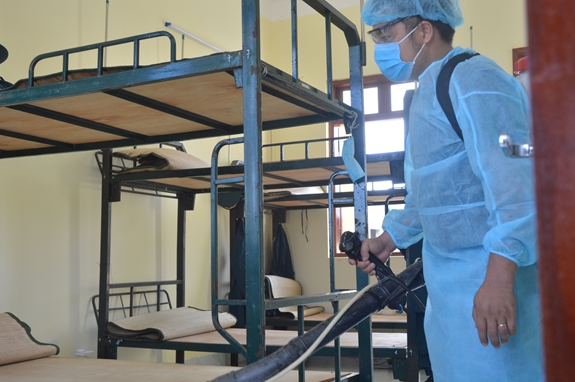 Hằng ngày, quân y đơn vị thực hiện khử trùng khu vực cách ly bằng dung dịch Cloramin B và lau bề mặt tiếp xúc bằng Cloramin B; đồng thời tổ chức tổng vệ sinh doanh trại và phun thuốc khử trùng cho tất cả các cơ quan, đơn vị trong trường.