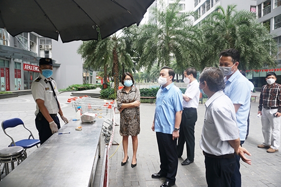 Báo cáo với đoàn công tác, Chủ tịch UBND quận Hoàng Mai Nguyễn Minh Tâm cho biết: Ngay sau khi có thông tin ca bệnh N.V.C, quận và phường đã xử lý phong tỏa tạm thời, phun khử khuẩn kịp thời nơi ở của bệnh nhân. Do vào ngày bầu cử đại biểu Quốc hội và Hội đồng nhân dân, quận đã tiến hành chuyển địa điểm đặt hòm phiếu bầu cử từ tầng 1 tòa nhà Park 9 sang Park 12 để đảm bảo phòng, chống dịch cho công dân đi bầu cử. Đồng thời, cử 6 đội mang hòm phiếu phụ vào các hộ trong diện cách ly tạm thời và thực hiện đầy đủ biện pháp phòng, chống dịch, đảm bảo không lây chéo.
