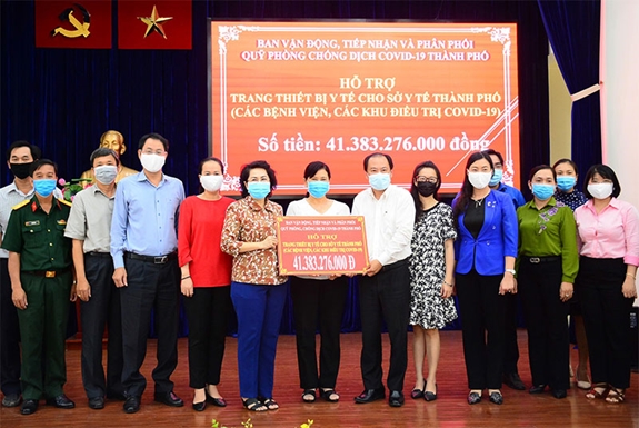 * Sáng 14-4, Ban Thường trực Ủy ban MTTQ TP Hồ Chí Minh tổ chức họp Ban Vận động, tiếp nhận và phân phối Quỹ Phòng, chống dịch Covid-19 và Ban Cứu trợ thành phố. Ban Vận động Quỹ Phòng, chống dịch Covid-19 thành phố đã tiếp nhận ủng hộ công tác phòng, chống dịch Covid-19 là hơn 128,4 tỷ đồng (tiền mặt hơn 107,9 tỷ đồng và hàng hóa trị giá hơn 20,5 tỷ đồng). Thời gian tới, Quỹ Phòng, chống dịch Covid-19 thành phố sẽ hỗ trợ mua trang thiết bị y tế (đợt 1) phục vụ công tác phòng, chống dịch Covid-19 với số tiền hơn 41,3 tỷ đồng; hỗ trợ các y sĩ, bác sĩ, nhân viên y tế tại Bệnh viện điều trị Covid-19 Cần Giờ và Bệnh viện dã chiến Củ Chi hơn 1,5 tỷ đồng. (Tin, ảnh: HÙNG KHOA)