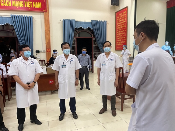 Đồng chí Lê Duy Thành, Phó bí thư Tỉnh ủy, Chủ tịch UBND tỉnh Vĩnh Phúc (ngoài cùng bên trái) kiểm tra công tác phòng, chống dịch tại Bệnh viện Đa khoa tỉnh Vĩnh Phúc tối 6-5. Ảnh: NĂM DUY.