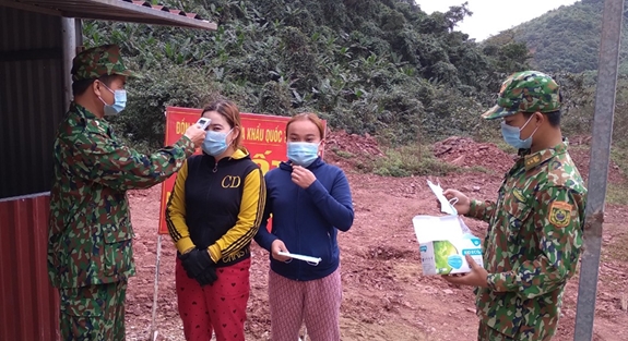 Chốt kiểm soát phòng, chống Covid-19, Đồn Biên phòng cửa khẩu quốc tế Cha Lo, BĐBP Quảng Bình đo thân nhiệt, phát khẩu trang cho người dân ra vào khu vực cửa khẩu. Ảnh: Trúc Hà