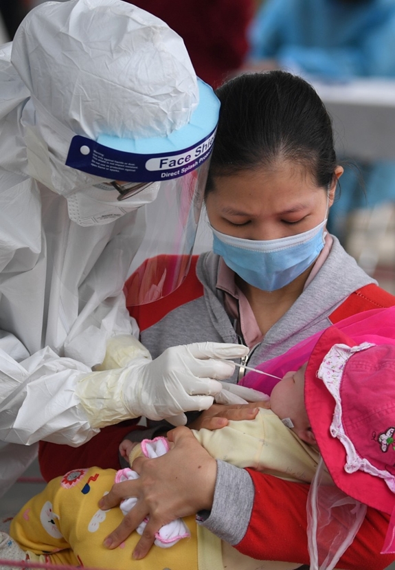 | Người già, trẻ nhỏ, từng hộ gia đình đi lấy mẫu xét nghiệm. |