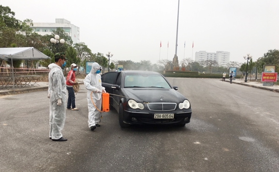 | Cán bộ, giáo viên nhà trường phun khử khuẩn phương tiện tại các chốt kiểm dịch. |