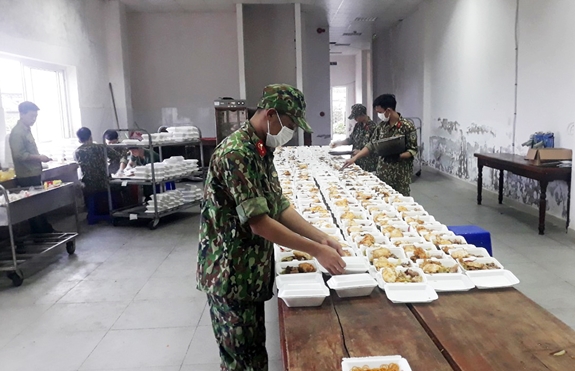 | Chuẩn bị bữa cơm phục vụ công dân cách ly y tế tập trung tại khu cách ly tỉnh Thừa Thiên Huế. |