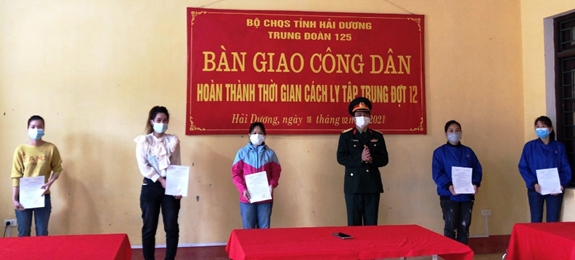 | Lãnh đạo Bộ CHQS tỉnh Hải Dương trao chứng nhận hoàn thành cách ly tập trung cho công dân tại Trung đoàn 125. |