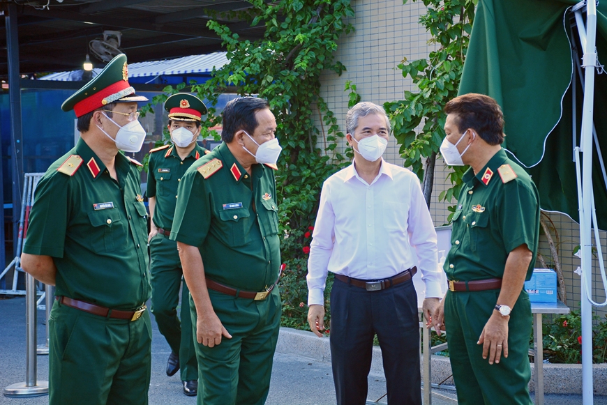 Tham dự buổi làm việc có các đồng chí: Thượng tướng Võ Minh Lương, Ủy viên Trung ương Đảng, Thứ trưởng Bộ Quốc phòng, Tổ trưởng Tổ công tác đặc biệt của Chính phủ tại TP Hồ Chí Minh; Nguyễn Trường Sơn, Thứ trưởng Bộ Y tế, Trưởng bộ phận thường trực đặc biệt của Bộ Y tế tại TP Hồ Chí Minh...