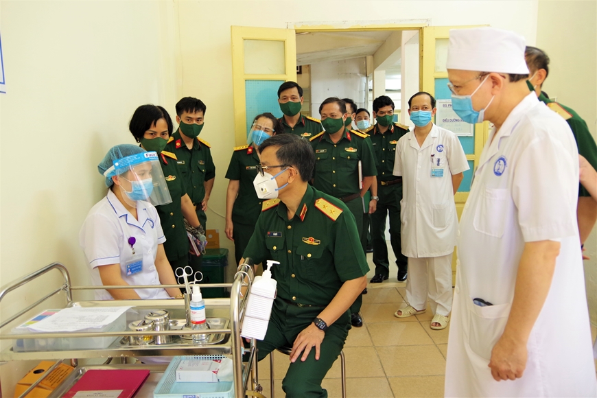 | Trung tướng Đỗ Quyết kiểm tra các khâu chuẩn bị tiêm chủng tại Bệnh viện Bỏng quốc gia Lê Hữu Trác. |