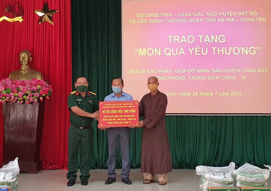 * Sáng 24-7, Bộ CHQS tỉnh Bà Rịa-Vũng Tàu phối hợp với chùa Giác Ngộ (xã Láng Dài, huyện Đất Đỏ) và các mạnh thường quân trên địa bàn tỉnh, tổ chức chương trình “Món quà yêu thương” hỗ trợ lương thực, thực phẩm giúp đỡ nhân dân huyện Châu Đức.