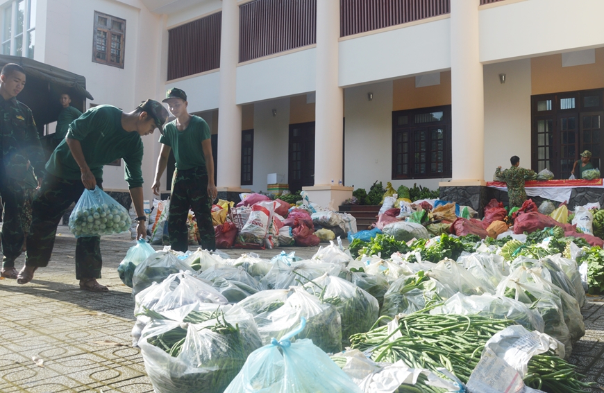 | Cán bộ, chiến sĩ Bộ CHQS tỉnh Bình Phước chuyển nông sản hỗ trợ Bộ tư lệnh TP Hồ Chí Minh chống dịch. |