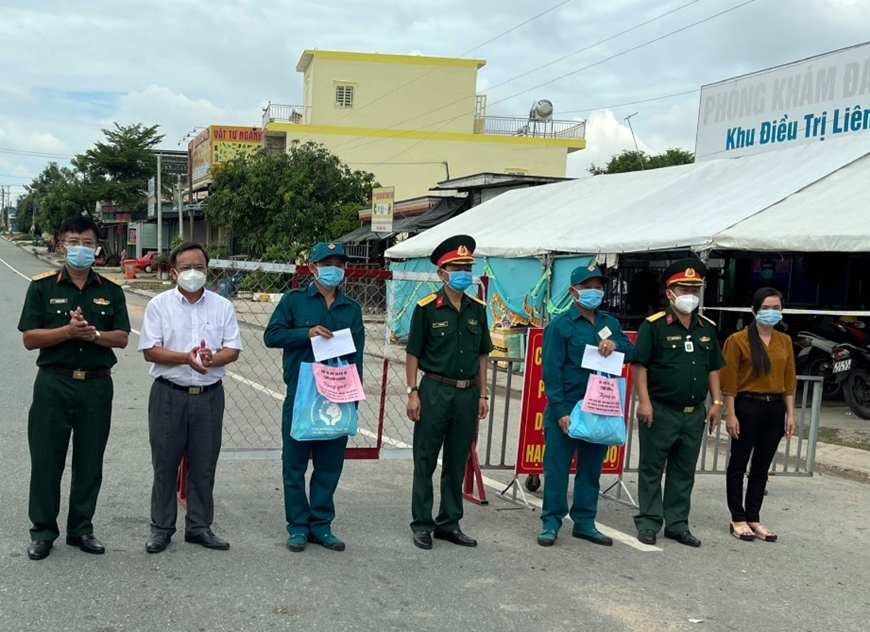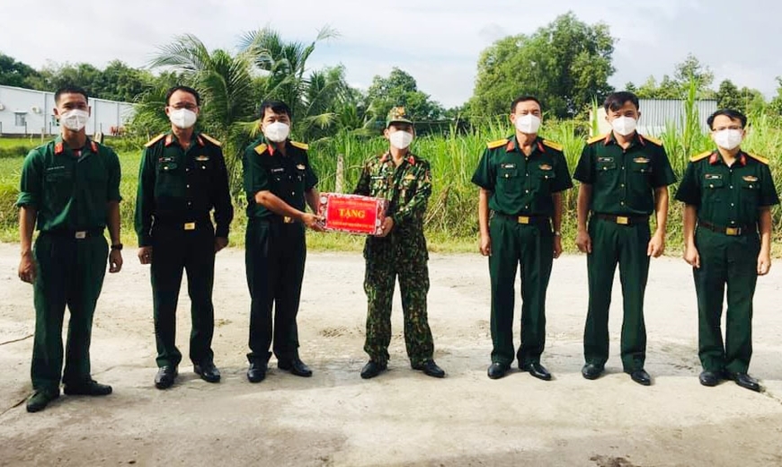 | Cán bộ Sư đoàn 5 tặng quà, động viên cán bộ, chiến sĩ chống dịch tại tỉnh Long An. |