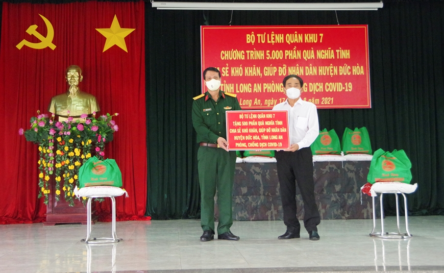 * Ngày 17-8, Đoàn công tác Bộ tư lệnh Quân khu 7 do Đại tá Nguyễn Công Anh, Phó chủ nhiệm Chính trị Quân khu là trưởng đoàn đã đến thăm hỏi, động viên và trao tặng 500 phần quà nghĩa tình cho các gia đình có hoàn cảnh khó khăn do đại dịch Covid-19 tại huyện Đức Hòa, Long An. Tổng giá trị quà tặng 250 triệu đồng.