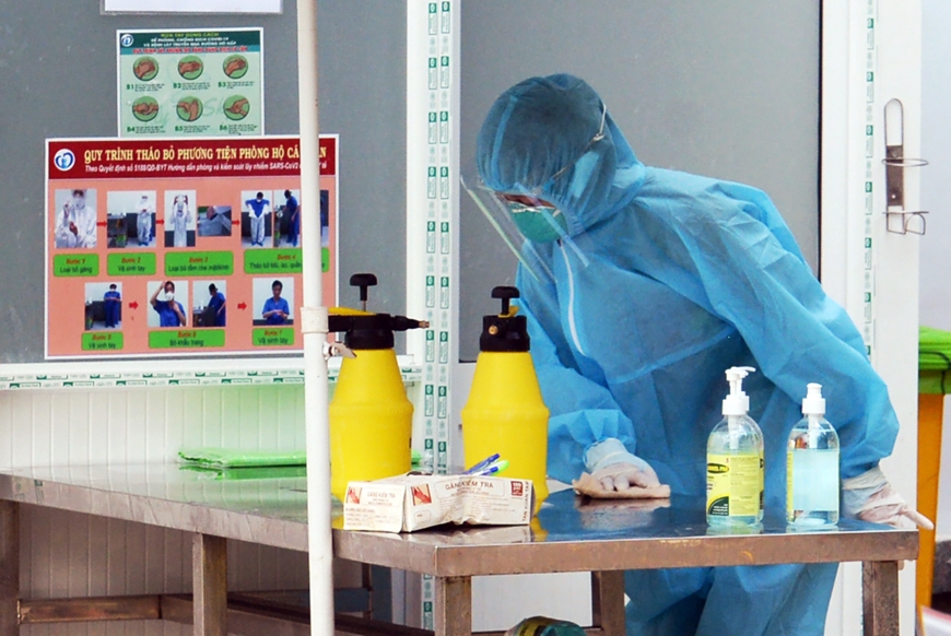 | Chiến sĩ dân quân phun khử khuẩn khu vực bệnh viện dã chiến số 3 |