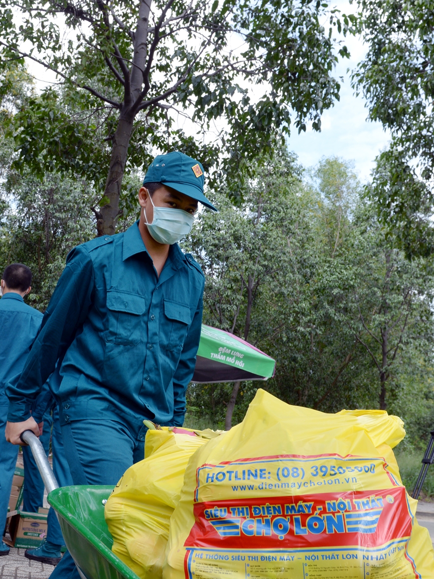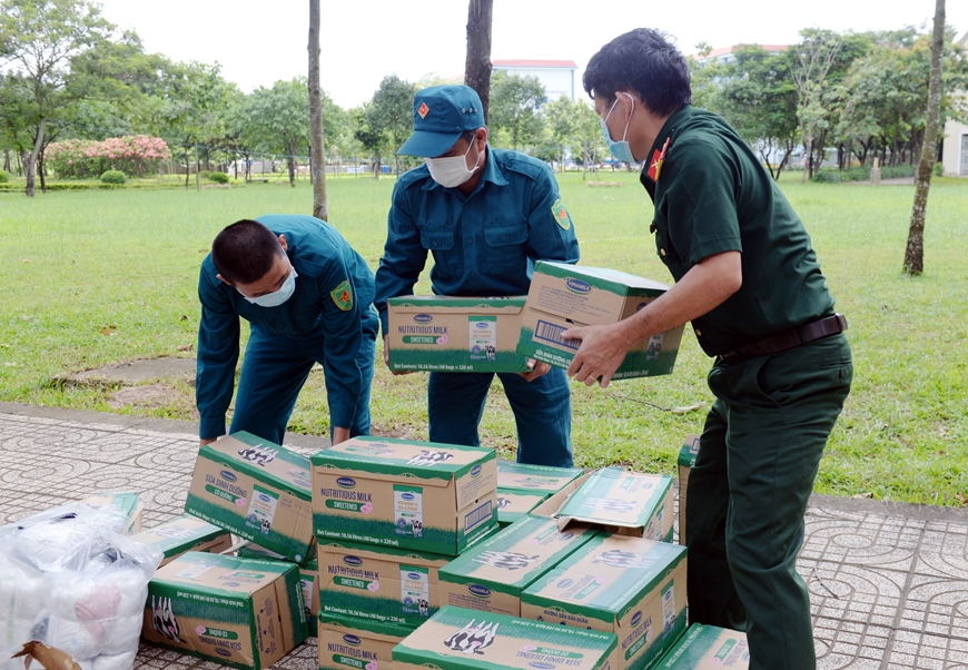 | Tại bệnh viện dã chiến truyền nhiễm số 3 tỉnh Đồng Nai, cán bộ, chiến sĩ và lực lượng dân quân tích cực hỗ trợ vận chuyển nhu yếu phẩm cung cấp cho nhân viên và người bệnh. |