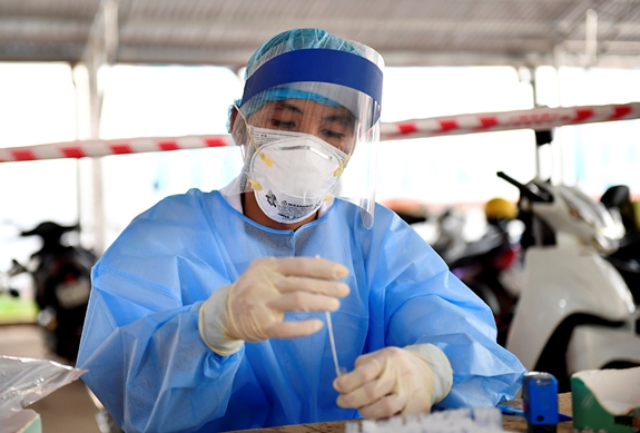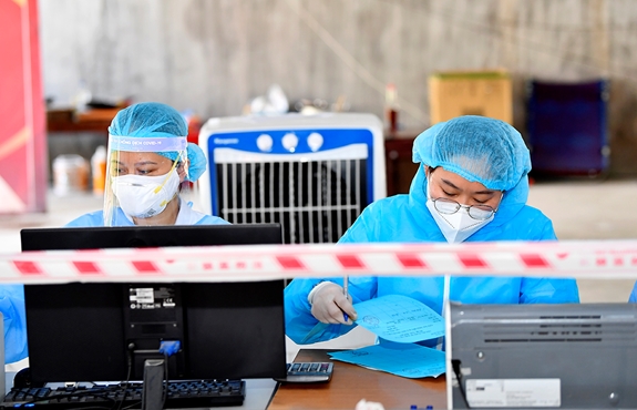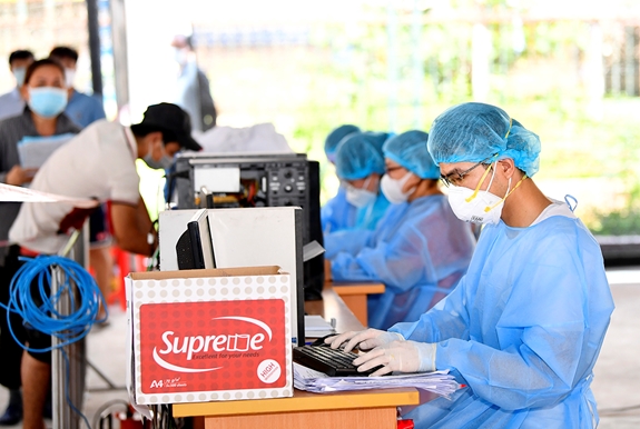 | Nhân viên y tế tiến hành các thủ tục đăng ký test nhanh và phân loại mức độ nguy cơ lây nhiễm virus SARS-Cov-2. |