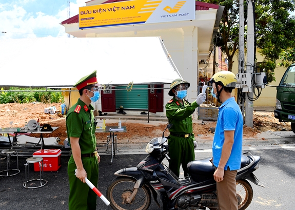 | Cán bộ, chiến sĩ công an huyện tăng cường tại các tổ chốt, kiểm soát người, phương tiện ra, vào các khu vực có dịch. |