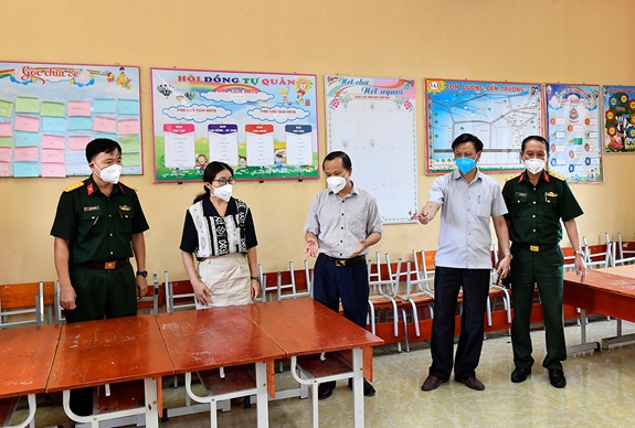 | Đồng chí Mai Sơn, Phó chủ tịch Thường trực UBND tỉnh Bắc Giang (thứ ba, từ phải qua) kiểm tra công tác bảo đảm cơ sở vật chất các phòng dùng làm nơi cách ly công dân. |