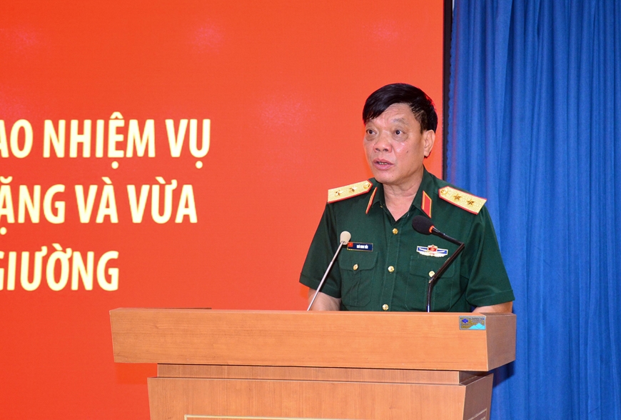 | Trung tướng Ngô Minh Tiến phát biểu giao nhiệm vụ tại buổi lễ. |