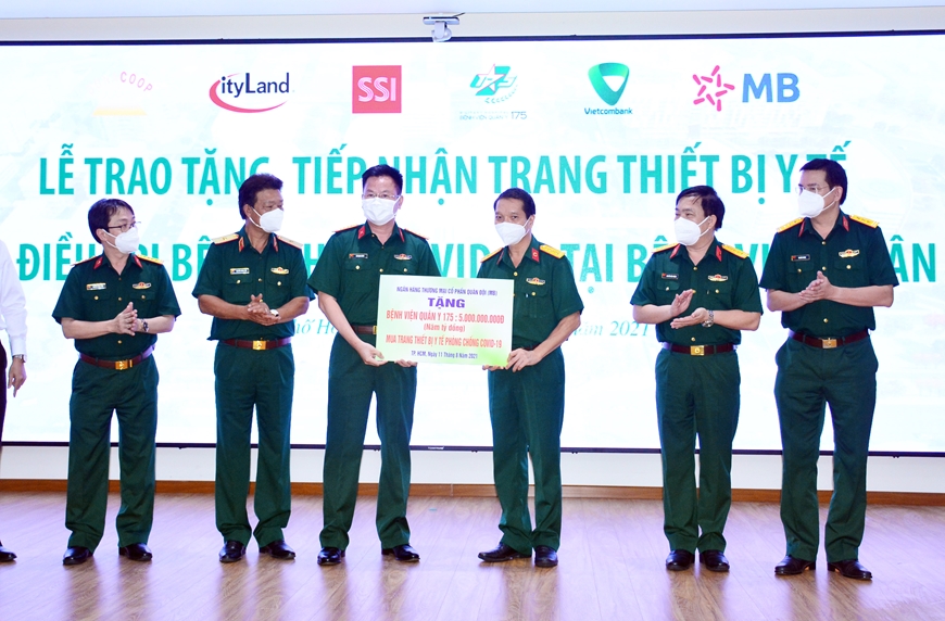 | Ngân hàng Thương mại Cổ phần Quân đội trao kinh phí hỗ trợ mua sắm trang thiết bị y tế điều trị bệnh nhân Covid-19 cho Bệnh viện Quân y 175. |