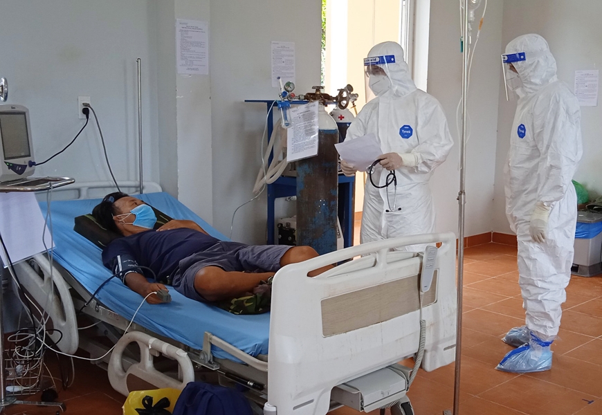| Các bác sĩ, nhân viên y tế Bệnh viện dã chiến truyền nhiễm số 5 (Bộ Quốc phòng) đặt tại Sư đoàn 317 (Quân khu 7) ở huyện Hóc Môn, TP Hồ Chí Minh điều trị bệnh nhân Covid-19. |