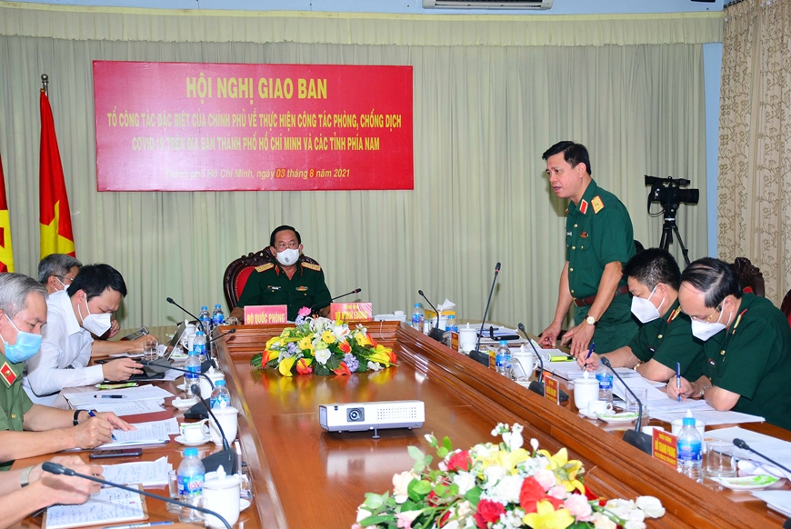 Tham dự hội nghị có các đồng chí: Trung tướng Ngô Minh Tiến, Phó tổng Tham mưu trưởng Quân đội nhân dân Việt Nam, Phó trưởng Ban chỉ đạo PCD Covid-19 Bộ Quốc phòng; Thiếu tướng Lê Hồng Dũng, Phó chủ nhiệm Tổng cục Hậu cần; Thiếu tướng Nguyễn Trường Thắng, Ủy viên Trung ương Đảng, Tư lệnh Quân khu 7; Nguyễn Trường Sơn, Thứ trưởng Bộ Y tế, Tổ phó tổ công tác đặc biệt; cùng dự có lãnh đạo UBND TP Hồ Chí Minh, các thành viên của tổ công tác.