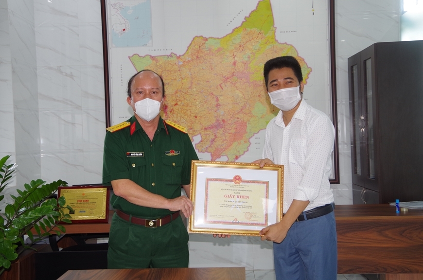 * Ngày 3-8, đoàn công tác của Bộ CHQS tỉnh Bình Dương đã đến trao giấy khen và gửi lời cảm ơn các doanh nghiệp có nhiều đóng góp, hỗ trợ lực lượng vũ trang tỉnh trong công tác phòng, chống dịch bệnh Covid-19.
