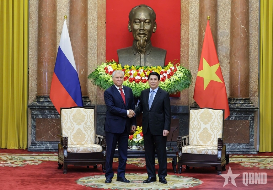 Chủ tịch nước Lương Cường tiếp Chủ tịch Duma Quốc gia Quốc hội Liên bang Nga Vyacheslav Volodin. Ảnh: qdnd.vn |