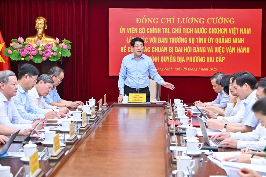 Chiều 29-7, tại Quảng Ninh, Chủ tịch nước Lương Cường và đoàn công tác Trung ương đã làm việc với Ban Thường vụ Tỉnh ủy Quảng Ninh về công tác chuẩn bị đại hội Đảng các cấp và việc vận hành chính quyền địa phương 2 cấp.