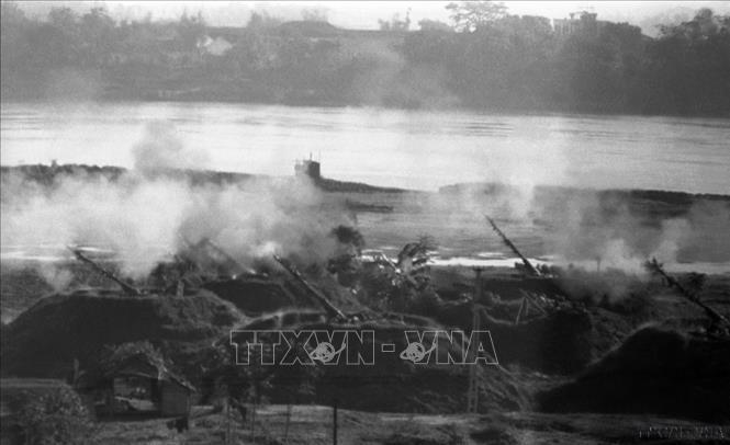 | Trận địa pháo cao xạ Hà Nội bảo vệ cầu Long Biên nhả đạn vào máy bay Mỹ. Ảnh: TTXVN |