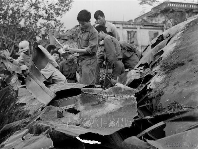 | Xác máy bay B.52 của Mỹ bị quân và dân Thủ đô bắn rơi hồi 23 giờ, ngày 27-12-1972, tại ngõ 2 Thụy Khuê. Ảnh: TTXVN |