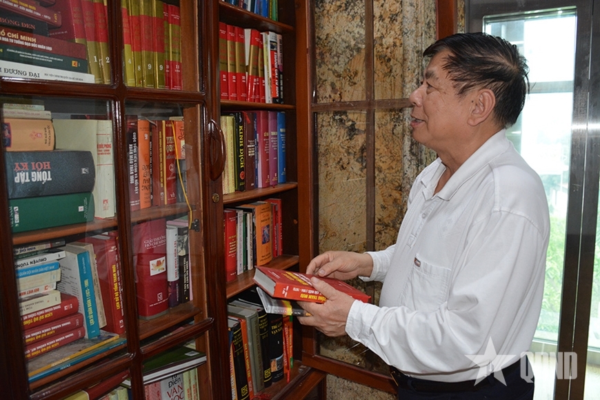 | Trung tướng Nguyễn Đức Sơn và không gian sách tại nhà riêng ở Hà Nội. |