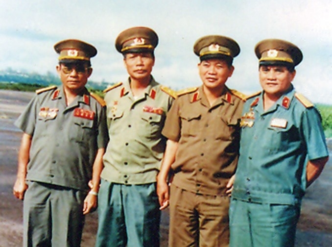 | Thiếu tướng Phạm Bân, nguyên Phó tư lệnh Mặt trận 579 (ngoài cùng, bên phải) cùng các đồng chí lãnh đạo Quân khu 5, tháng 12-1988. Ảnh tư liệu |