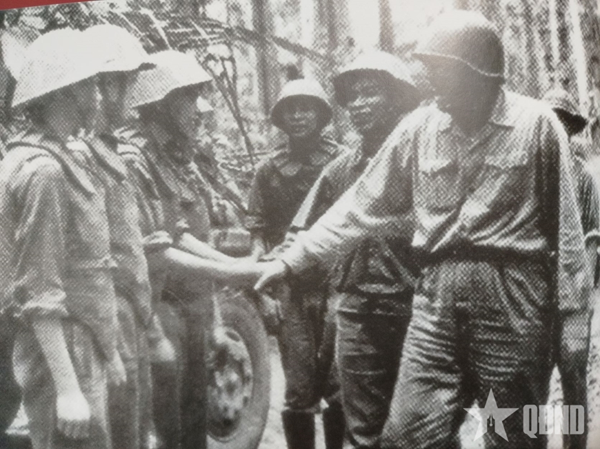 Tư lệnh Đồng Sỹ Nguyên (đi đầu, bên phải) và Phó tư lệnh Phan Khắc Hy (đứng sau) đến giao nhiệm vụ và động viên chiến sĩ Tiểu đoàn 102, Binh trạm 12, đơn vị mũi nhọn trong Chiến dịch mùa khô năm 1972.