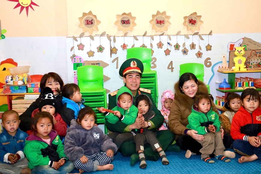 Trung tướng, GS, TS Phan Tùng Sơn cùng giáo viên và học sinh trường mầm non tại xóm Lũng Cắm, xã Huy Giáp, huyện Bảo Lạc, tỉnh Cao Bằng (nay là xã Huy Giáp, tỉnh Cao Bằng). Ảnh: Nhân vật cung cấp
