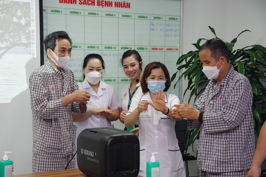 | Nhân viên y tế hướng dẫn người bệnh các bước rửa tay chống nhiễm khuẩn. |