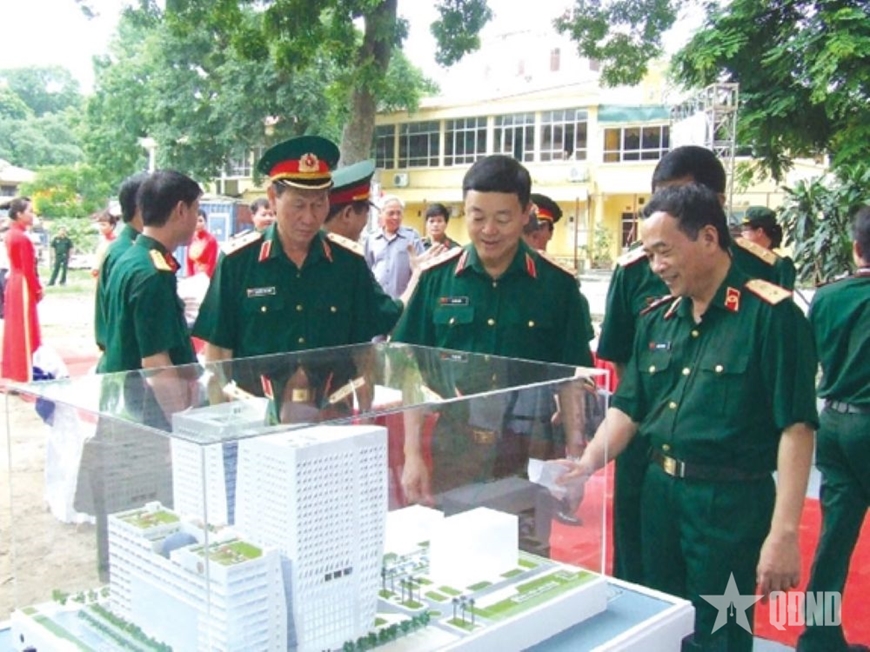 Trung tướng Trần Duy Anh (ngoài cùng, bên phải) thuyết trình với lãnh đạo Bộ Quốc phòng về thiết kế kiến trúc Bệnh viện Trung ương Quân đội 108 trong lễ khởi công tháng 7-2012.