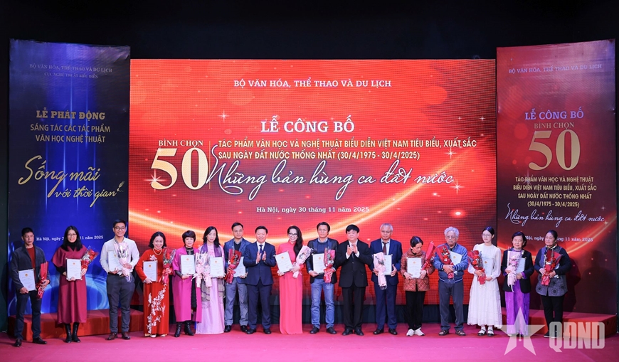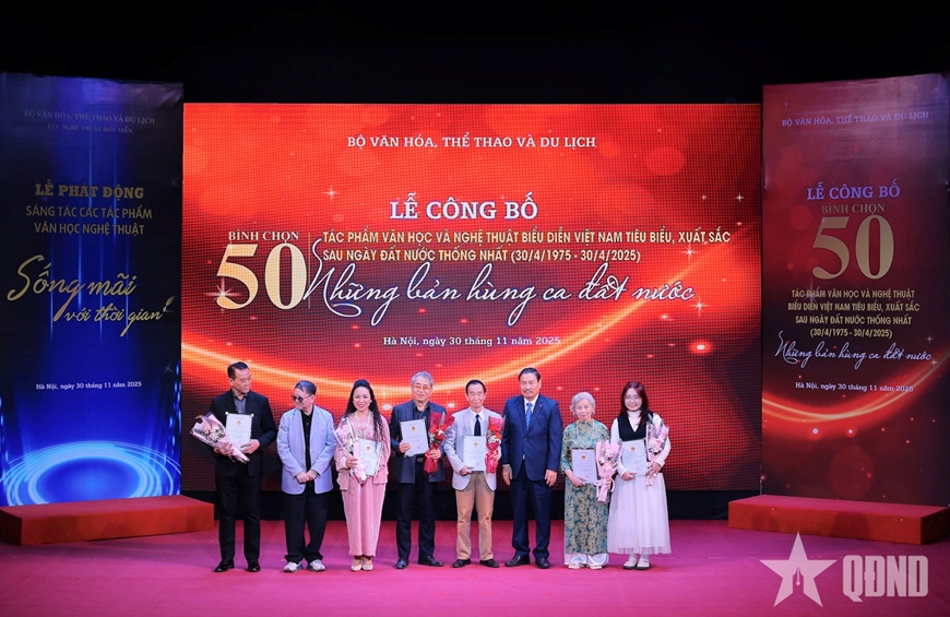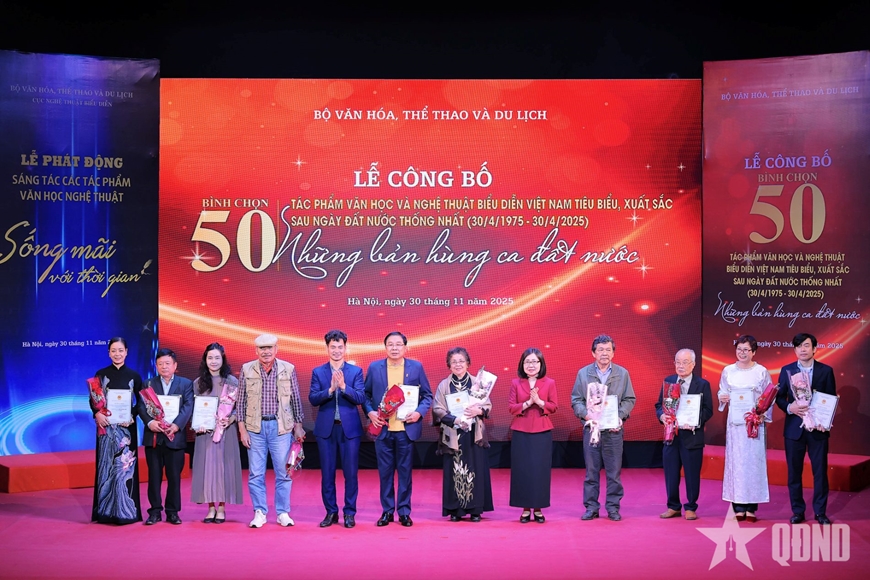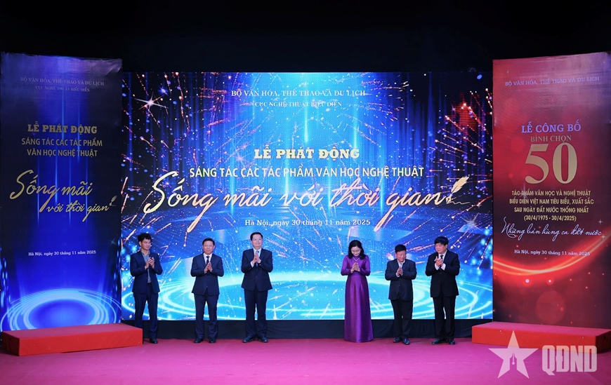 Ngày 30-11, tại Hà Nội, Bộ Văn hóa, Thể thao và Du lịch (VHTTDL) giao Cục Nghệ thuật biểu diễn tổ chức Lễ công bố bình chọn 50 tác phẩm văn học, nghệ thuật biểu diễn Việt Nam tiêu biểu, xuất sắc sau ngày đất nước thống nhất (1975 - 2025); đồng thời phát động sáng tác các tác phẩm văn học nghệ thuật “Sống mãi với thời gian” giai đoạn 2026 - 2030 hướng tới 100 năm Ngày thành lập Đảng Cộng sản Việt Nam (1930 - 2030) và 85 năm Ngày Quốc khánh nước Cộng hòa xã hội chủ nghĩa Việt Nam (1945 - 2030).