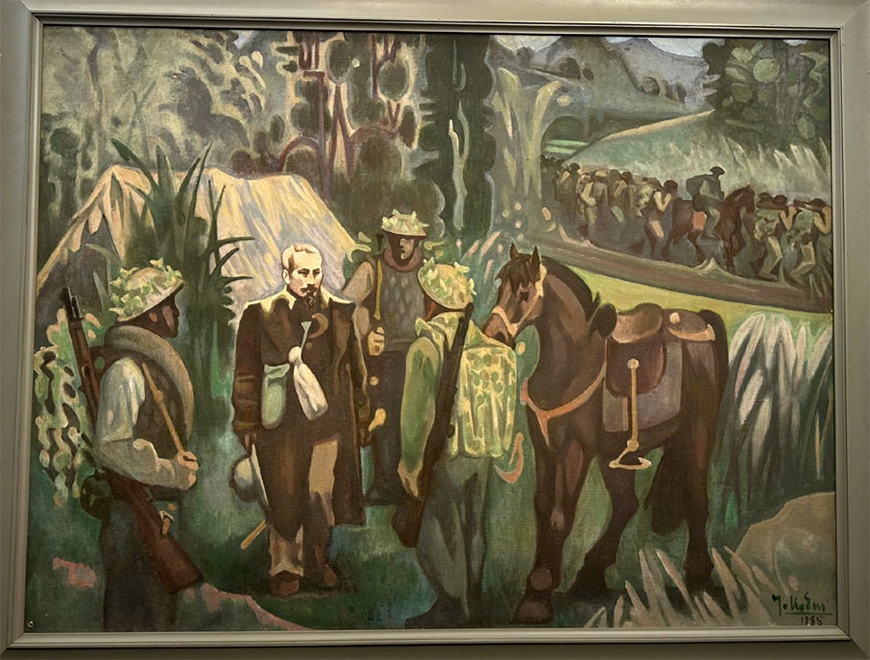 | Tác phẩm tranh sơn dầu "Rời lều cỏ Bác tiếp tục hành quân" của tác giả Nguyễn Trọng Kiệm. |