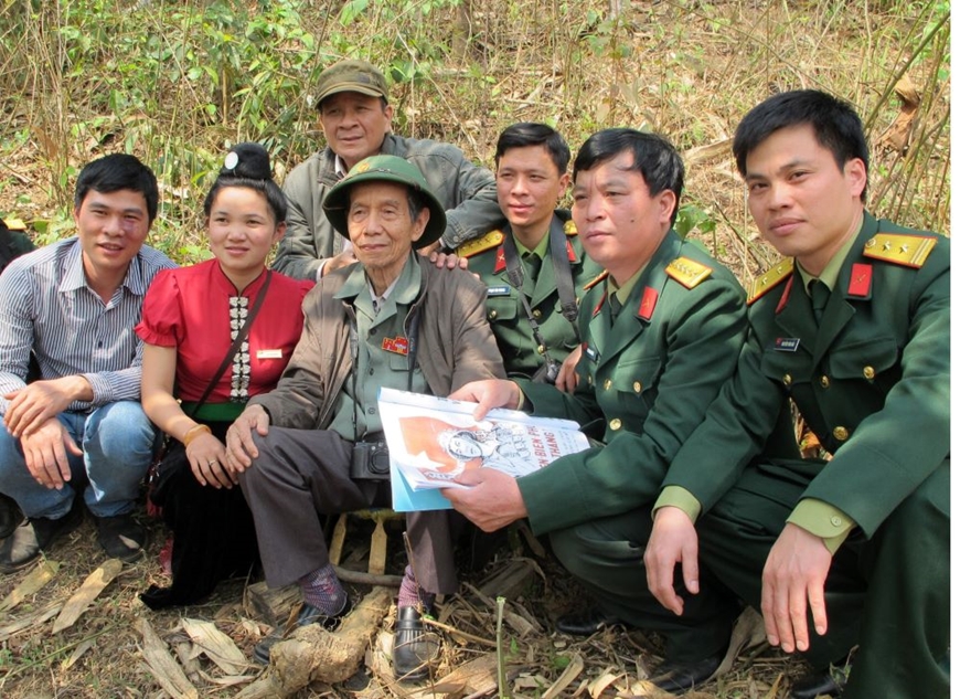 Nhà báo Phạm Phú Bằng (ngồi giữa) thăm địa điểm Tòa soạn tiền phương Báo Quân đội nhân dân tại Mường Phăng, TP Điện Biên Phủ, tỉnh Điện Biên (tháng 2-2014). Ảnh: HUYỀN PHƯƠNG