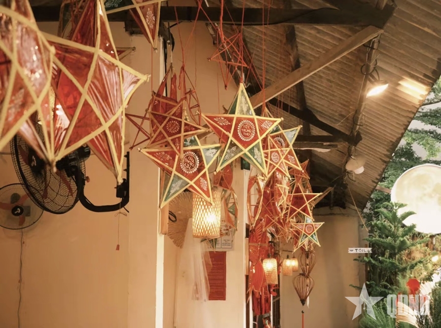 Một góc quán cà phê trang trí lồng đèn Trung thu, gợi nhớ về ký ức tuổi thơ và nét đẹp truyền thống giữa phố phường hiện đại.