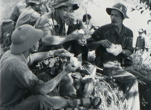 | Bữa cơm chia tay trước khi lên đường nhận nhiệm vụ mới tại rừng Trường Sơn của các chiến sĩ Điện ảnh Quân đội, NSND Đặng Xuân Hải, Chủ tịch Hội Điện ảnh Việt Nam (giữa). Ảnh tư liệu Điện ảnh Quân đội. |