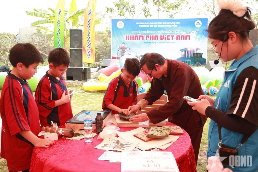 | Nghệ nhân Nguyễn Hữu Quả tận tình hướng dẫn học sinh từng thao tác in mộc bản. Ảnh: NVCC |