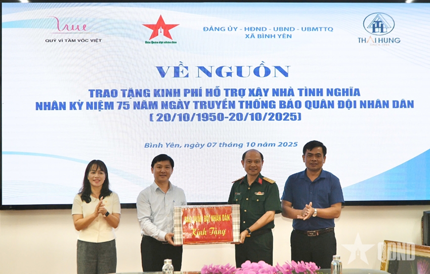 Báo Quân đội nhân dân phối hợp với Công ty Cổ phần Thương mại Thái Hưng và Ngân hàng Thương mại Cổ phần Bắc Á trao kinh phí hỗ trợ xây dựng nhà tình nghĩa tặng hộ gia đình khó khăn ở xã Bình Yên, tỉnh Thái Nguyên. |