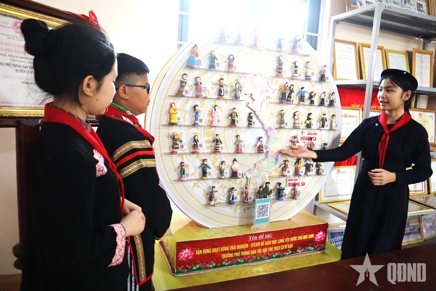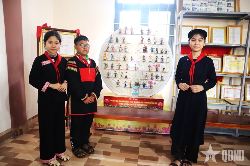 Trên nền bản đồ Việt Nam hình chữ S, 54 hình nhân đất sét đại diện cho 54 dân tộc được các em tỉ mỉ nặn thủ công. Mỗi nhân vật cao hơn 10cm nhưng được chăm chút từ màu sắc, hoa văn đến kiểu dáng trang phục. Để bảo đảm tính chính xác, nhóm đã dành nhiều tuần tra cứu tài liệu, đối chiếu hình ảnh nhằm giữ đúng “hồn cốt” văn hóa truyền thống.