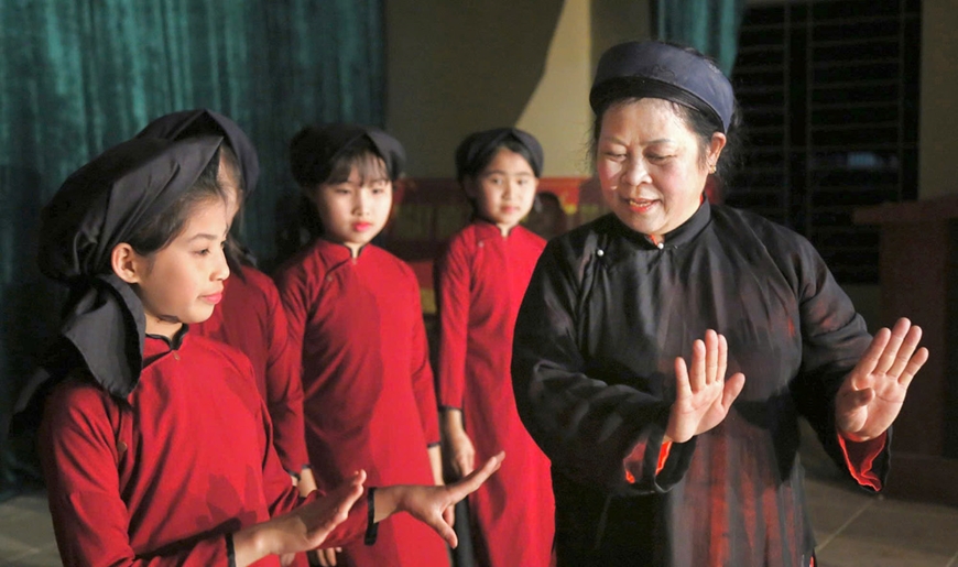 | Nghệ nhân Nhân dân Nguyễn Thị Lịch hướng dẫn thế hệ trẻ học múa và hát xoan. Ảnh do nhân vật cung cấp |