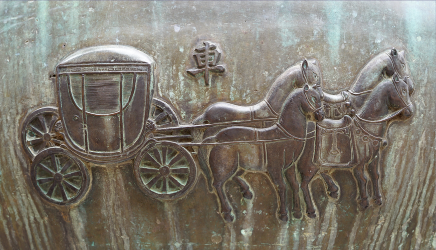 Hình tượng xa - xe tứ mã chạm khắc đồng trên Huyền đỉnh - Cửu đỉnh triều Nguyễn, năm 1837. Ảnh: HIỀN TRANG