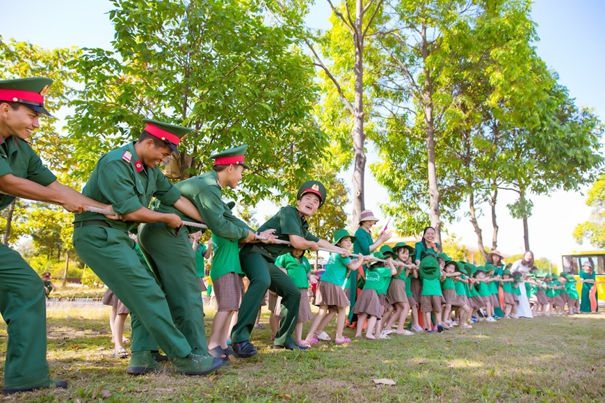 | Cán bộ, chiến sĩ Tiểu đoàn 7, Trung đoàn 31 (Sư đoàn 309) và cô, trò Trường Mầm non Hạnh phúc thi đấu kéo co. |