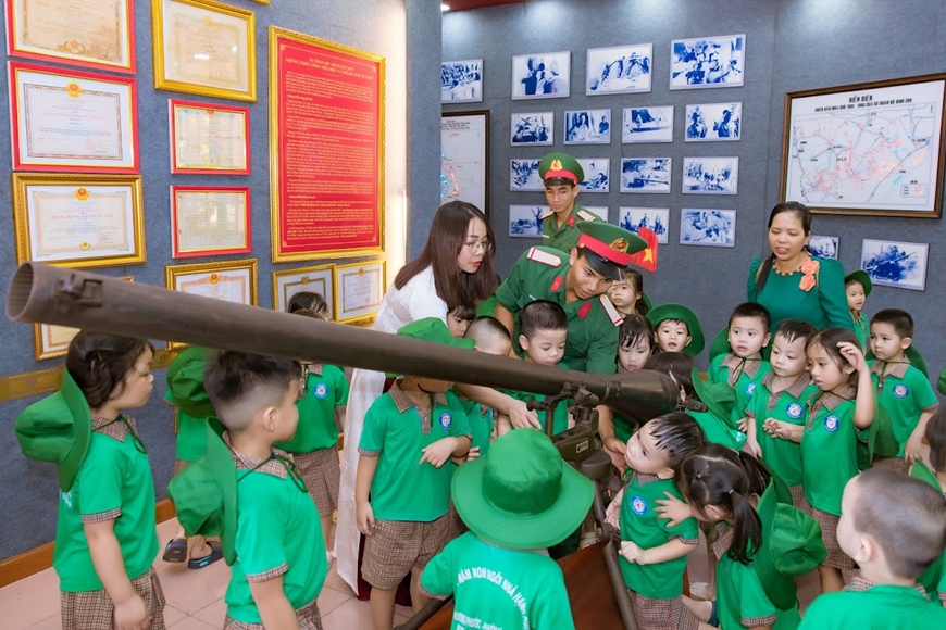 | Cô và trò Trường Mầm non Hạnh phúc tham quan khuôn viên doanh trại Sư đoàn 309 (Quân khu 7). |